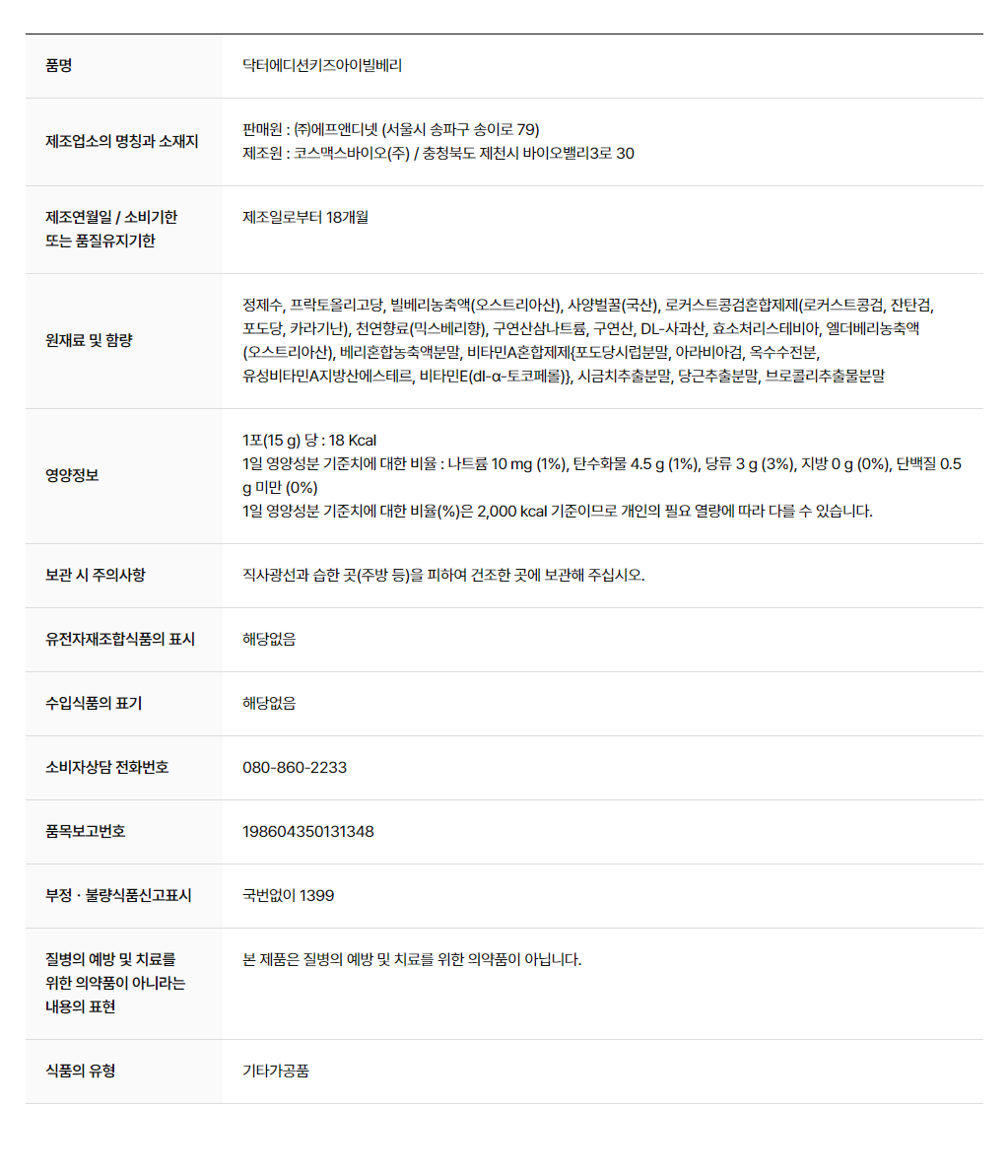 닥터에디션 키즈 아이 빌베리 30포 X 10박스